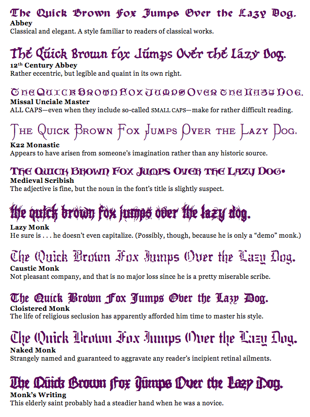 Each of the fonts below has some “monastic” connection. Obviously, some would be more useful than others, and a couple of them are admittedly quite peculiar. However, even the strangest of pens may be suitable for some applications.