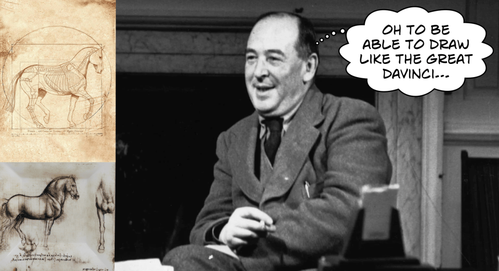 A final comment from Lewis’ youth worth noting. When writing to his friend Arthur Greeves in 1914, he refers to his scribblings and attempts (quite likely involving the Boxen era) when he attempted to sketch horses.