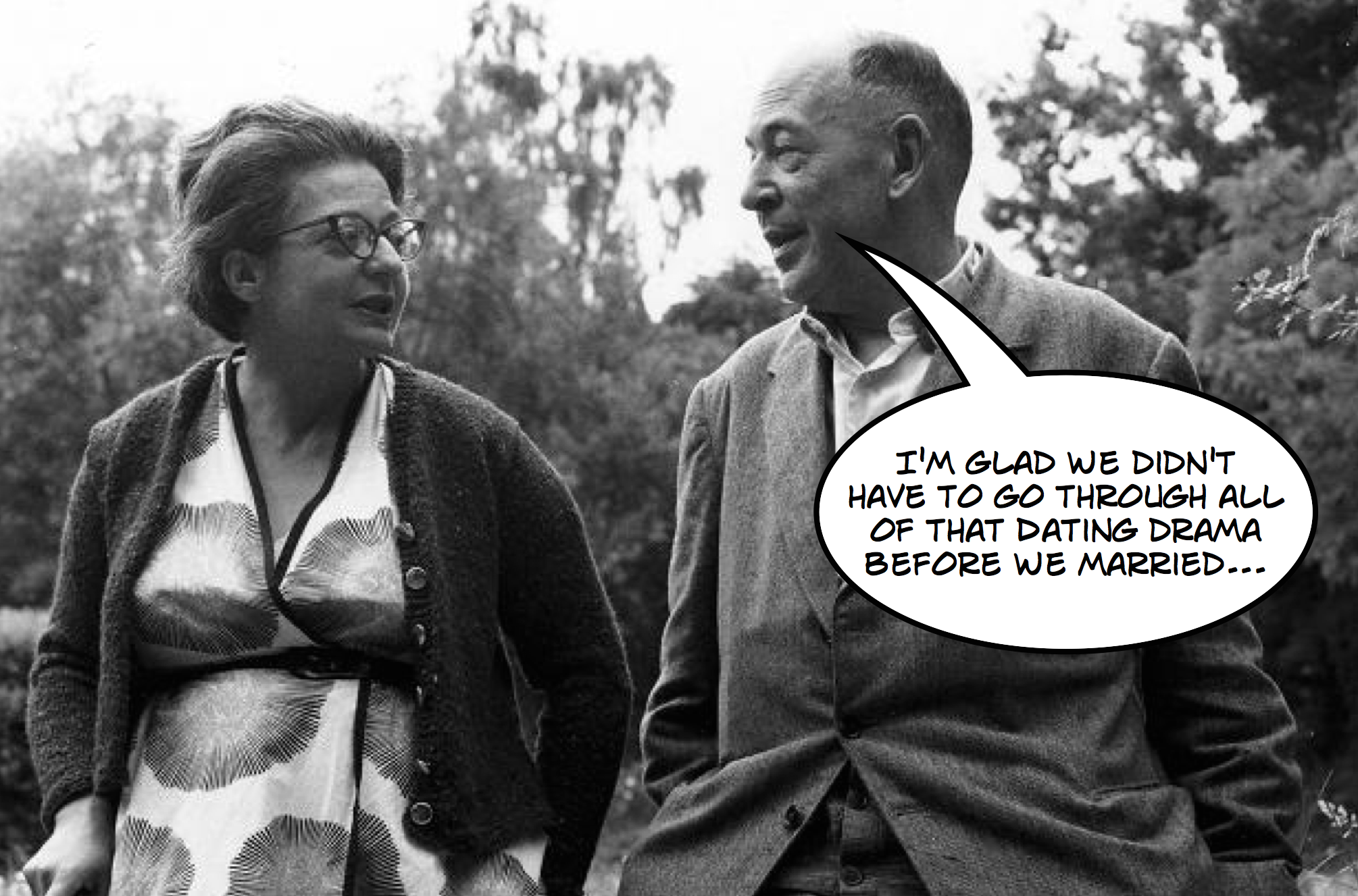 In August 1958 he wrote to a friend to say that “my wife walks up the wooded hill behind our house”; it seems likely that the image of her doing so was what went into the Atlantic essay. “All goes amazingly well with us.” (The Narnian: The Life and Imagination of C. S. Lewis).