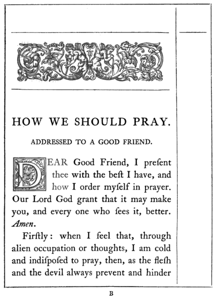 Luther graces the beginning of the book with a sincere prayer of blessing. “Dear Master Peter: I will tell you as best I can what I do personally when I pray. May our dear Lord grant to you and to everybody to do it better than I! Amen.”