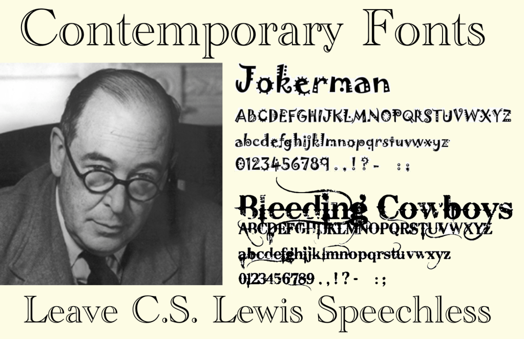 The writer offers her personal preferences (and prejudices). I don’t agree with all of her judgments, but I am forced to concur with her inclusion of Jokerman and Bleeding Cowboys on the list of “worst fonts.” And I am pretty sure that C.S. Lewis would agree.